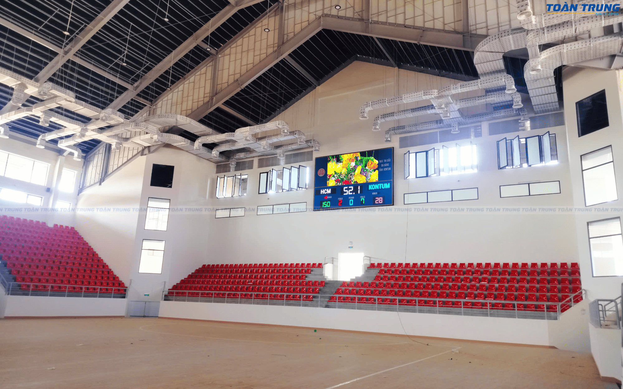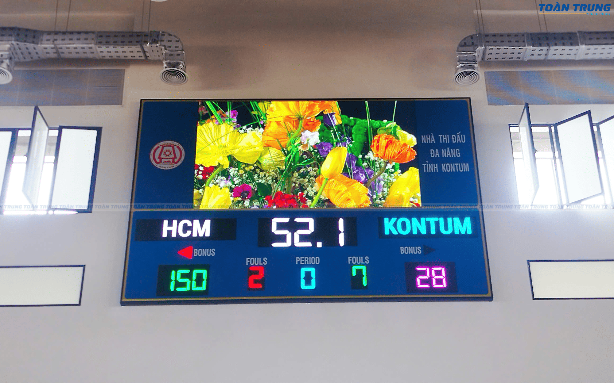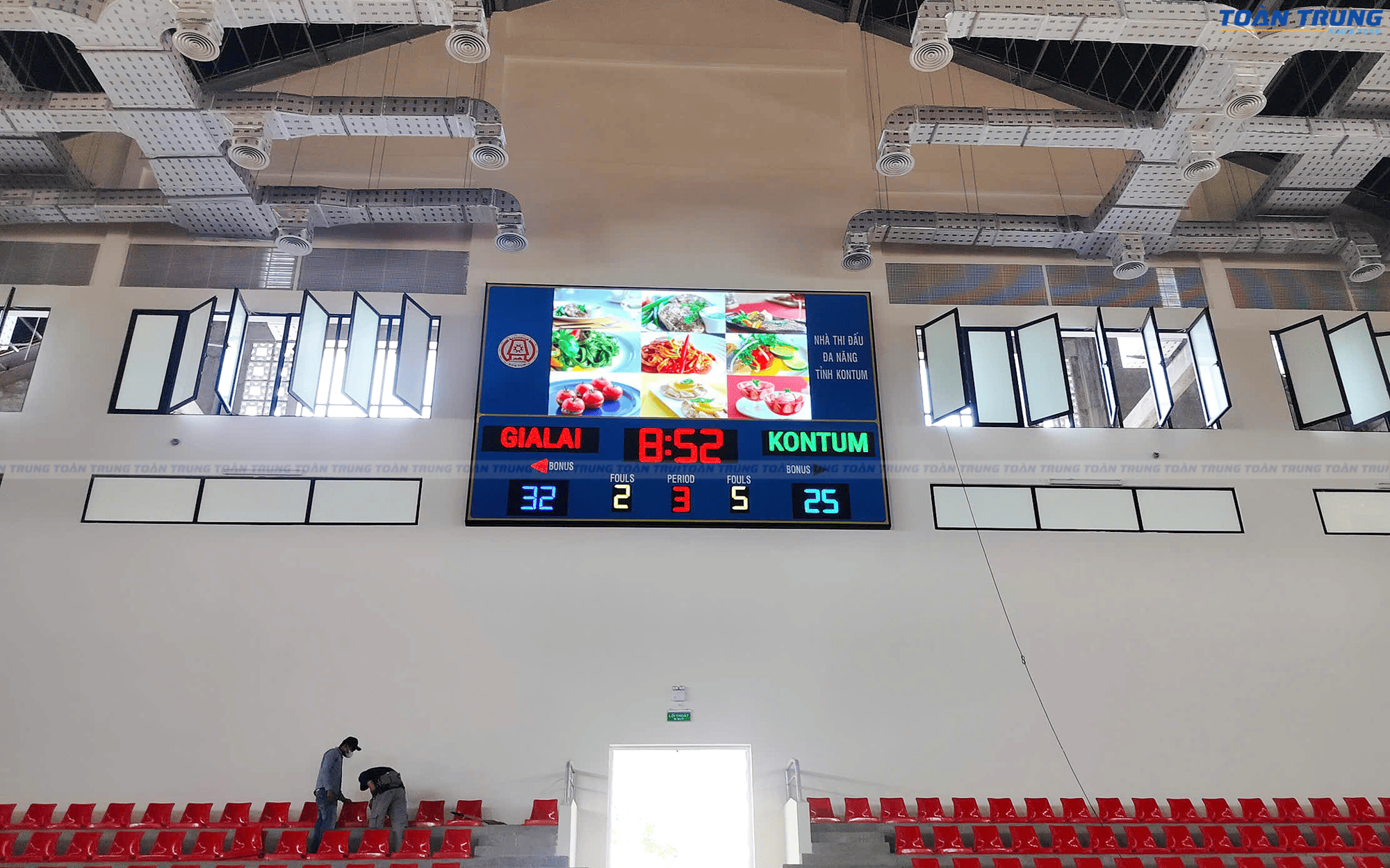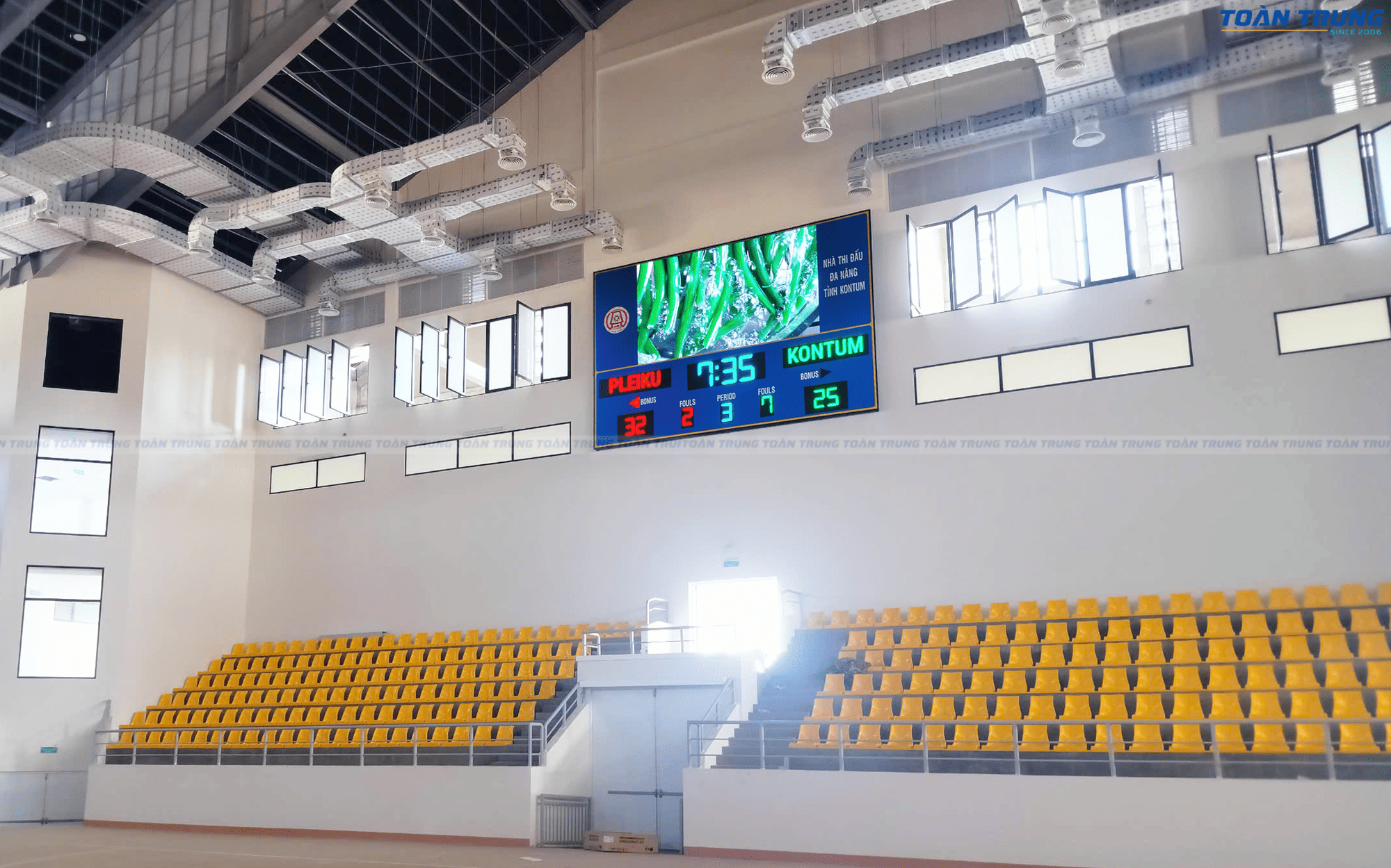 Nhà thi đấu Kon Tum vừa được trang bị bảng điện tử thi đấu đa môn, đáp ứng tiêu chuẩn chuyên nghiệp cho nhiều bộ môn thể thao như bóng rổ, cầu lông, bóng chuyền, futsal,... Với khả năng hiển thị rõ ràng, chính xác và linh hoạt, bảng điện tử giúp ban tổ chức dễ dàng quản lý thời gian, điểm số và thông tin trận đấu.