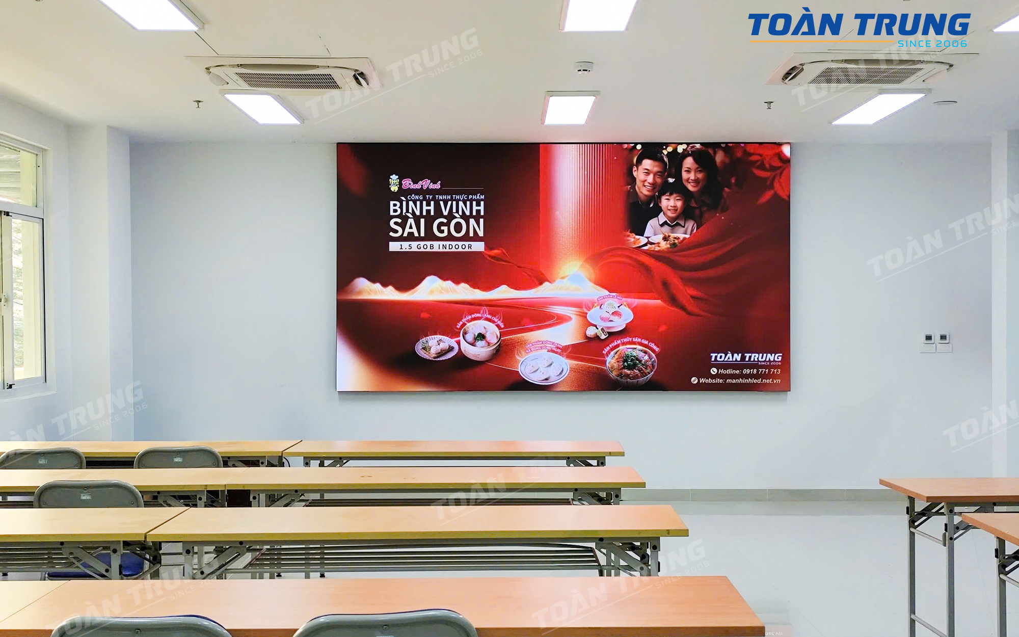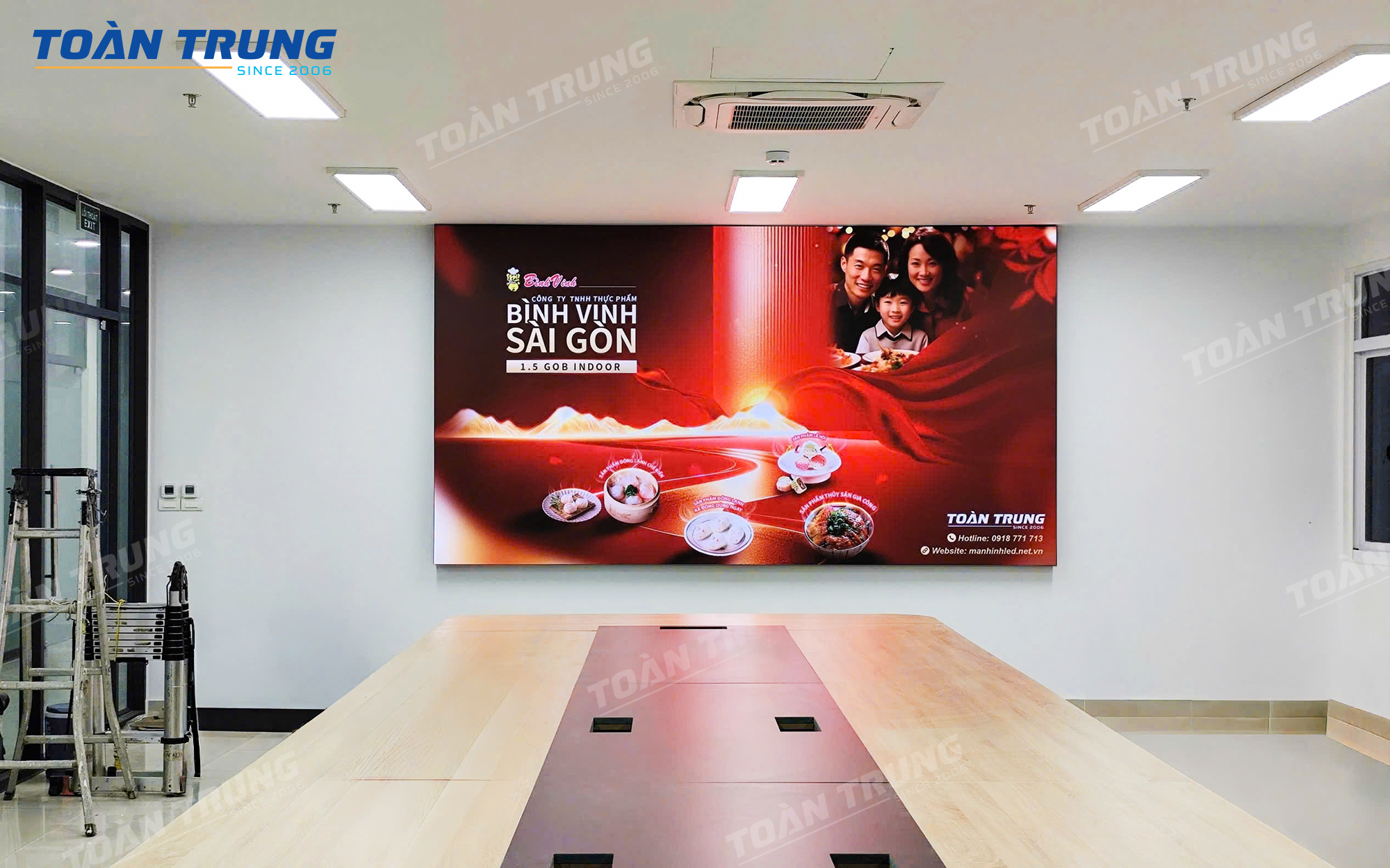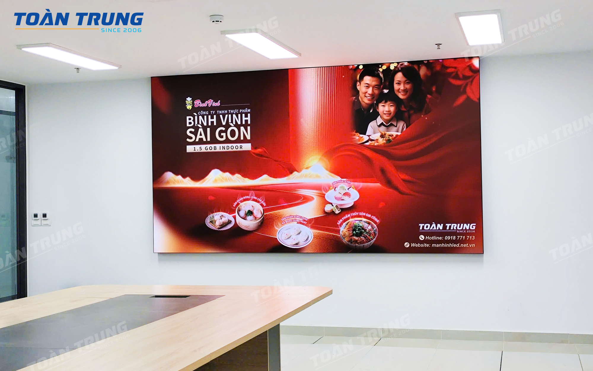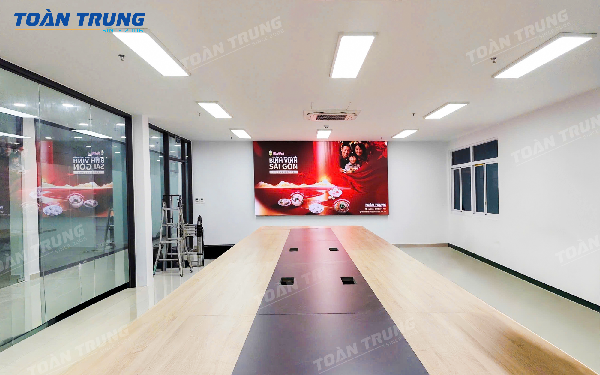 Công ty Bình Vinh – một đơn vị hoạt động trong lĩnh vực sản xuất và thương mại – mong muốn nâng cấp không gian hội họp và trình chiếu nội dung thương hiệu bằng giải pháp hiện đại, chuyên nghiệp hơn. Sau khi được đội ngũ Toàn Trung tư vấn, doanh nghiệp đã lựa chọn màn hình LED P1.5 GOB, một trong những dòng màn hình LED cao cấp nhất hiện nay, mang đến hình ảnh sắc nét, màu sắc chân thực và độ bền vượt trội.